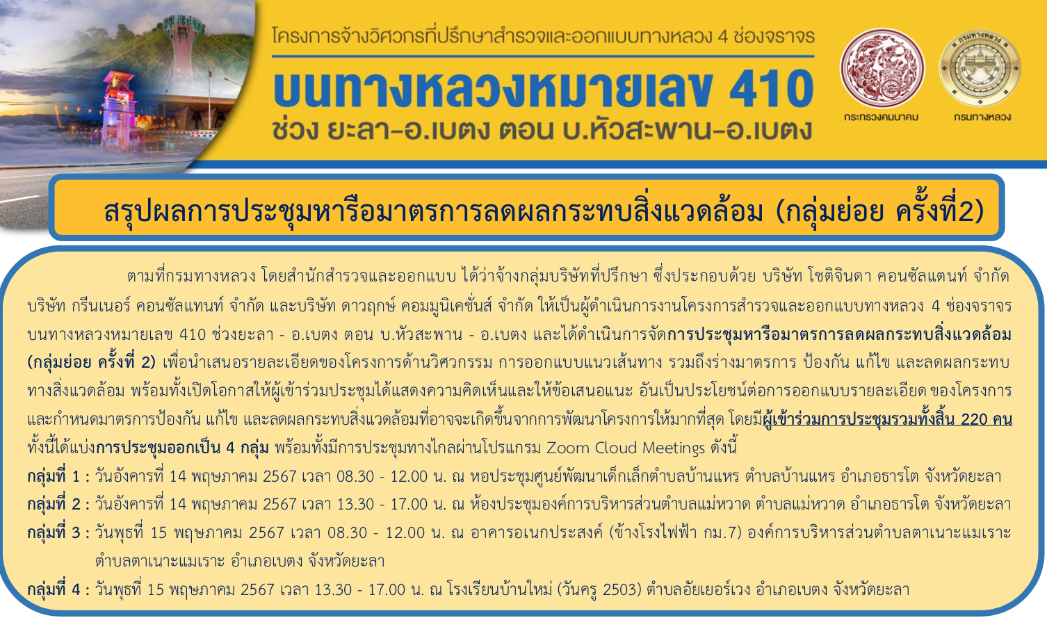 ตามที่กรมทางหลวง โดยสํานักสํารวจและออกแบบ ได้ว่าจ้างกลุ่มบริษัทที่ปรึกษา ซึ่งประกอบด้วย บริษัท โชติจินดา คอนซัลแตนท์ จํากัด บริษัท กรีนเนอร์ คอนซัลแทนท์ จํากัด และบริษัท ดาวฤกษ์ คอมมูนิเคชั่นส์ จํากัด ให้เป็นผู้ดําเนินการงานโครงการสํารวจและออกแบบทางหลวง 4 ช่องจราจร บนทางหลวงหมายเลข 410 ช่วงยะลา – อ.เบตง ตอน บ.หัวสะพาน – อ.เบตง และได้ดําเนินการจัดการประชุมหารือมาตรการลดผลกระทบสิ่งแวดล้อม (กลุ่มย่อย ครั้งที่ 2) เพื่อนําเสนอรายละเอียดของโครงการด้านวิศวกรรม การออกแบบแนวเส้นทาง รวมถึงร่างมาตรการป้องกัน แก้ไข และลดผลกระทบทางสิ่งแวดล้อม พร้อมทั้งเปิดโอกาสให้ผู้เข้าร่วมประชุมได้แสดงความคิดเห็นและให้ข้อเสนอแนะ อันเป็นประโยชน์ต่อการออกแบบรายละเอียดของโครงการ และกําหนดมาตรการป้องกัน แก้ไข และลดผลกระทบสิ่งแวดล้อมที่อาจจะเกิดขึ้นจากการพัฒนาโครงการให้มากที่สุด โดยมีผู้เข้าร่วมการประชุมรวมทั้งสิ้น 220 คน