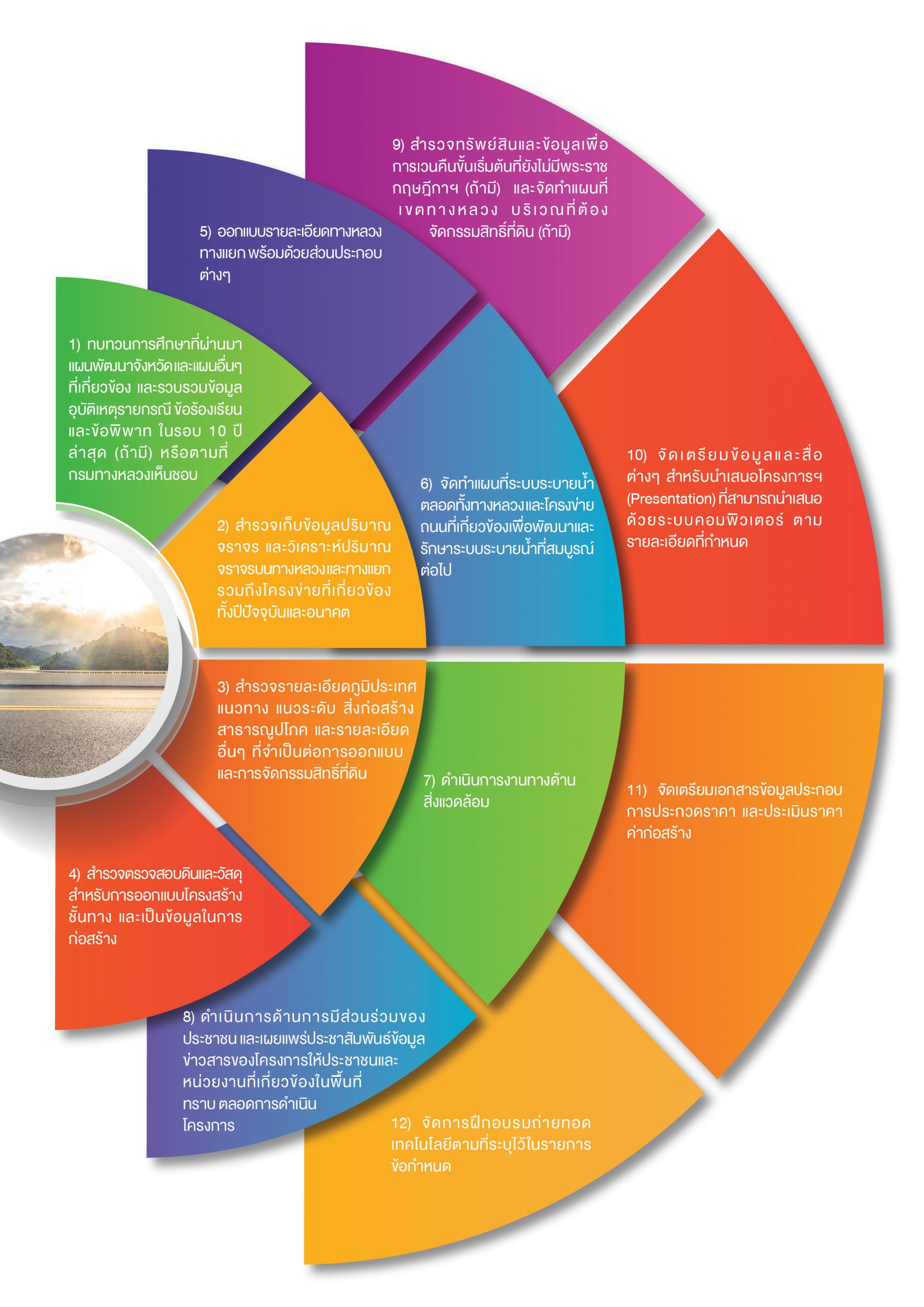 ค) ดำเนินการออกแบบรายละเอียดทางหลวง ทางแยก พร้อมด้วยส่วนประกอบต่างๆ ซึ่งในการออกแบบจะต้องดำเนินการให้เหมาะสมและสอดคล้องกับผลการวิเคราะห์การจราจร รูปแบบทันสมัย และมีเอกลักษณ์เฉพาะพื้นที่