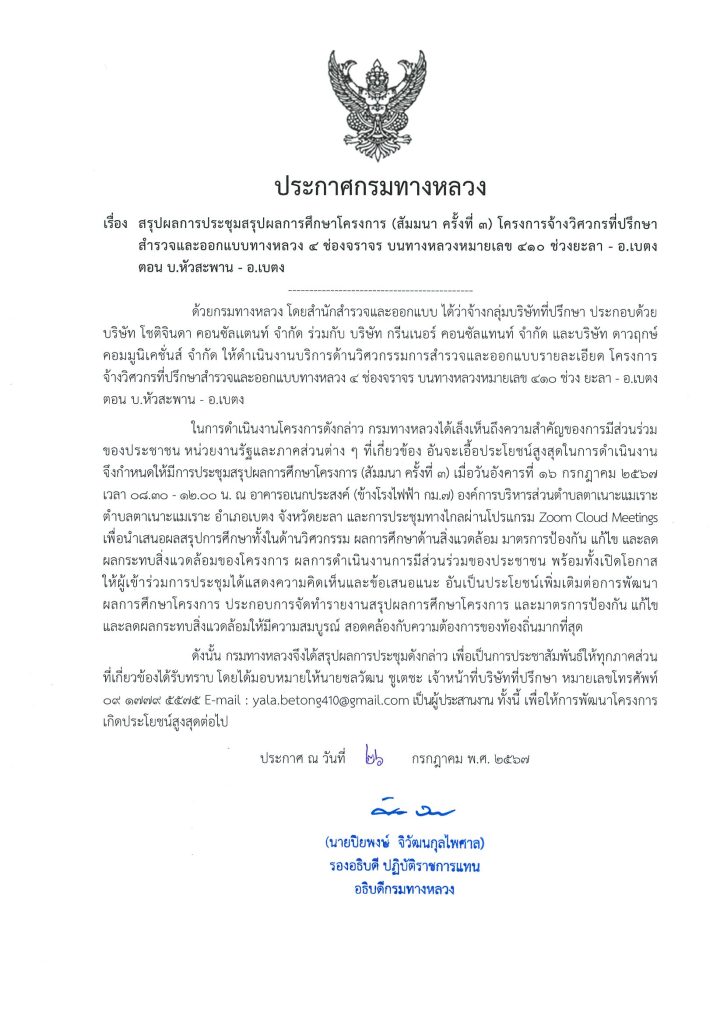กรมทางหลวง โดยสํานักสํารวจและออกแบบ ร่วมกับกลุ่มที่ปรึกษา ประกอบด้วย บริษัท โชติจินดา คอนซัลแตนท์ จํากัด บริษัท กรีนเนอร์ คอนซัลแทนท์ จํากัด และบริษัท ดาวฤกษ์ คอมมูนิเคชั่นส์ จํากัด ได้จัดให้มีการประชุมสรุปผลการศึกษาโครงการ (สัมมนา ครั้งที่ 3) เมื่อวันอังคารที่ 16 กรกฎาคม 2567 เวลา 08.30 – 12.00 น. ณ อาคารอเนกประสงค์ (ข้างโรงไฟฟ้า กม.7) องค์การบริหารส่วนตําบล ตาเนาะแมเราะ ตําบลตาเนาะแมเราะ อําเภอเบตง จังหวัดยะลา และการประชุมทางไกลผ่านโปรแกรม Zoom Cloud Meetings มีวัตถุประสงค์ เพื่อนําเสนอผลสรุปการศึกษาทั้งในด้านวิศวกรรม ผลการศึกษาด้านสิ่งแวดล้อม มาตรการป้องกัน แก้ไขและลดผลกระทบสิ่งแวดล้อม ของโครงการ ผลการดําเนินงานการมีส่วนร่วมของประชาชน พร้อมทั้งเปิดโอกาสให้ผู้เข้าร่วมการประชุมได้แสดงความคิดเห็นและข้อเสนอแนะ อันเป็นประโยชน์เพิ่มเติมต่อการพัฒนาผลการศึกษาโครงการ ประกอบการจัดทํารายงานสรุปผลการศึกษาโครงการให้มีความสมบูรณ์ และมาตรการป้องกัน แก้ไข และลดผลกระทบสิ่งแวดล้อมให้สอดคล้องกับความต้องการของท้องถิ่นมากที่สุด โดยได้รับเกียรติจาก นายอมร ชุ่มช่วย นายอําเภอเบตง เป็นประธานเปิดการประชุม ผู้เข้าร่วมประชุมประกอบด้วย ผู้แทนหน่วยงานราชการ หน่วยงานรัฐวิสาหกิจ หน่วยงานภาคเอกชน พื้นที่อ่อนไหวด้านสิ่งแวดล้อม สื่อมวลชน องค์กรปกครองส่วนท้องถิ่น ผู้นําชุมชน และประชาชนที่อาจได้รับผลกระทบ รวมทั้งสิ้น 168 คน
